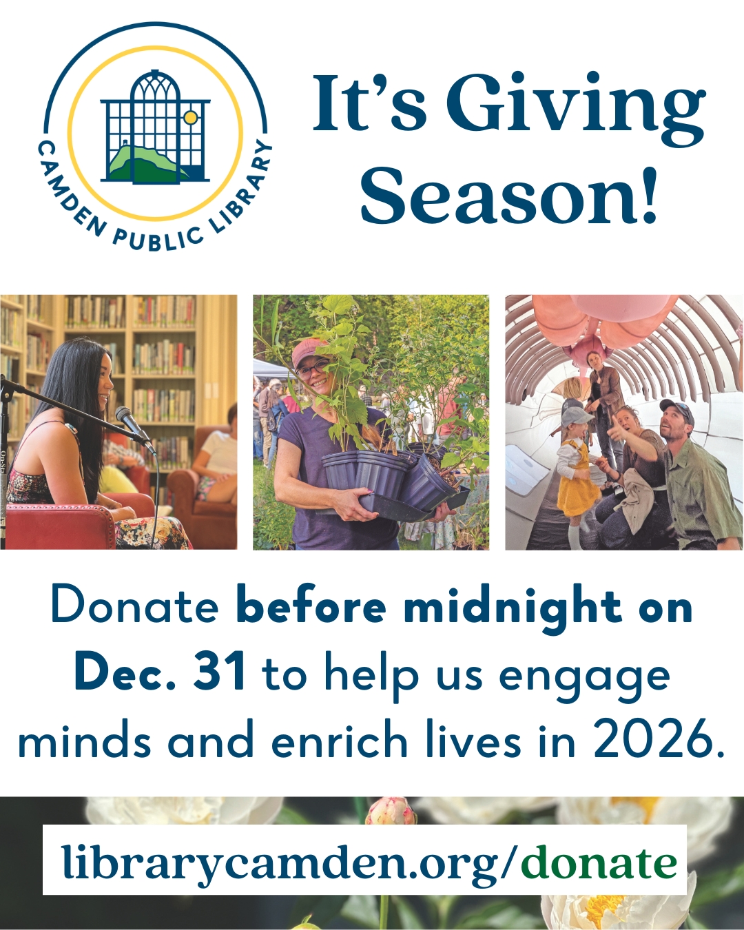 Give before midnight, Dec. 31, to help the Camden Public Library engage minds and enrich lives in 2026! Let’s celebrate all we can do together.
