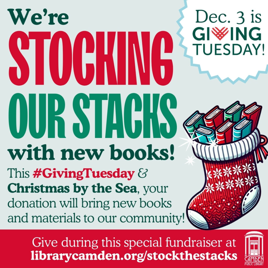 “Imagine the holiday stockings of the Camden Public Library filled with new books for all to enjoy. You can make that vision a reality. Donating to bring in new books and materials is a powerful way to support a lifetime of stories for our community members, from avid-reading retirees to the babies who join in Miss Amy’s story-time songs,” said Camden Public Library Executive Director Kristy Kilfoyle. “I invite you to join us in ‘Stocking the Stacks’ with new books in celebration of GivingTuesday and Christmas By The Sea.”