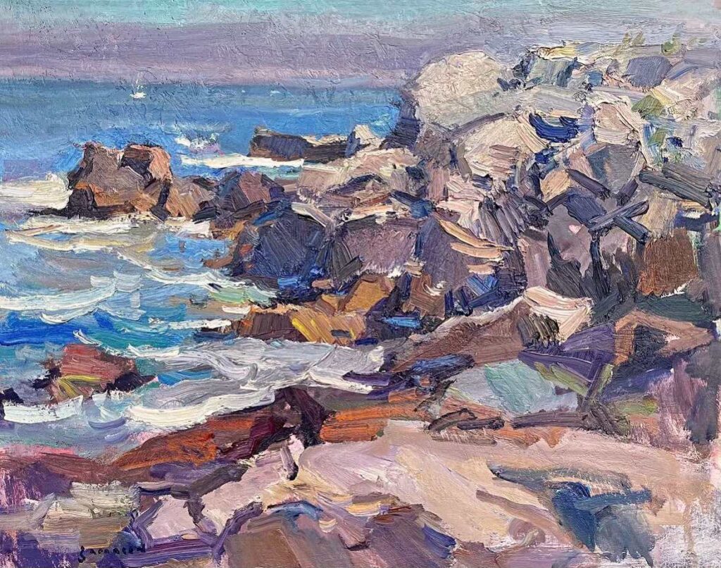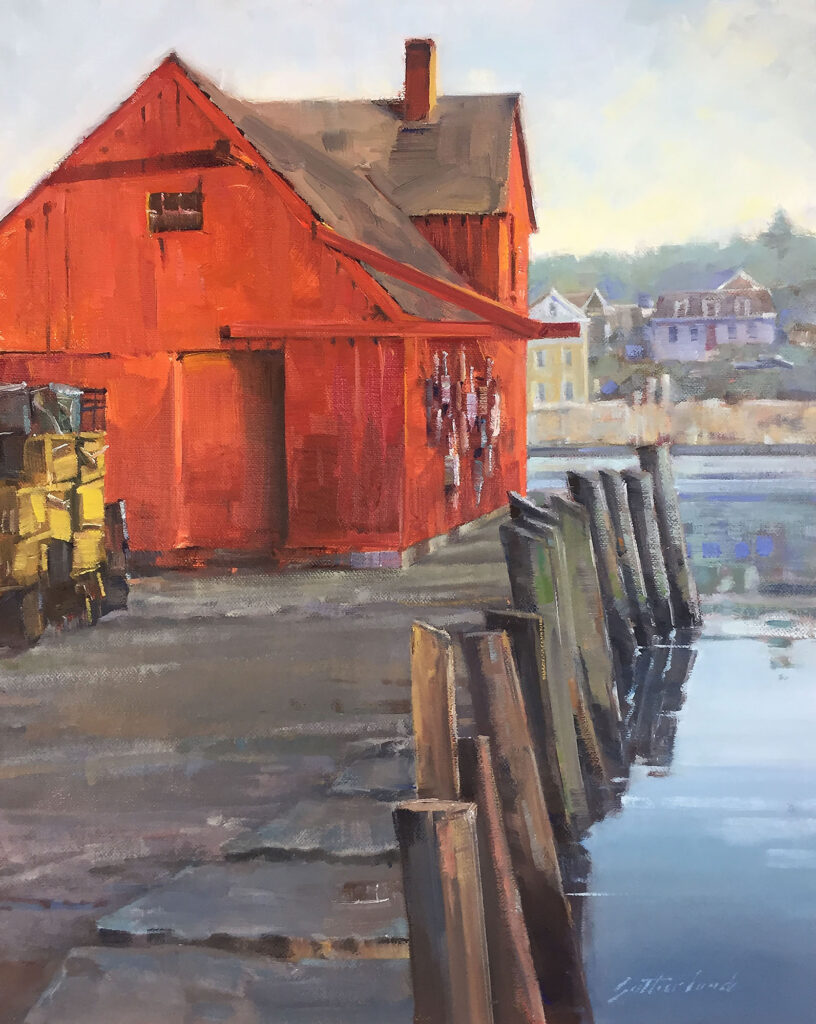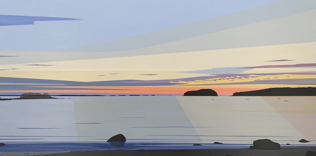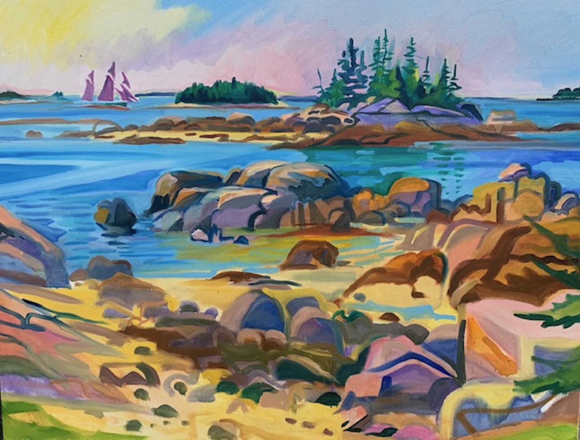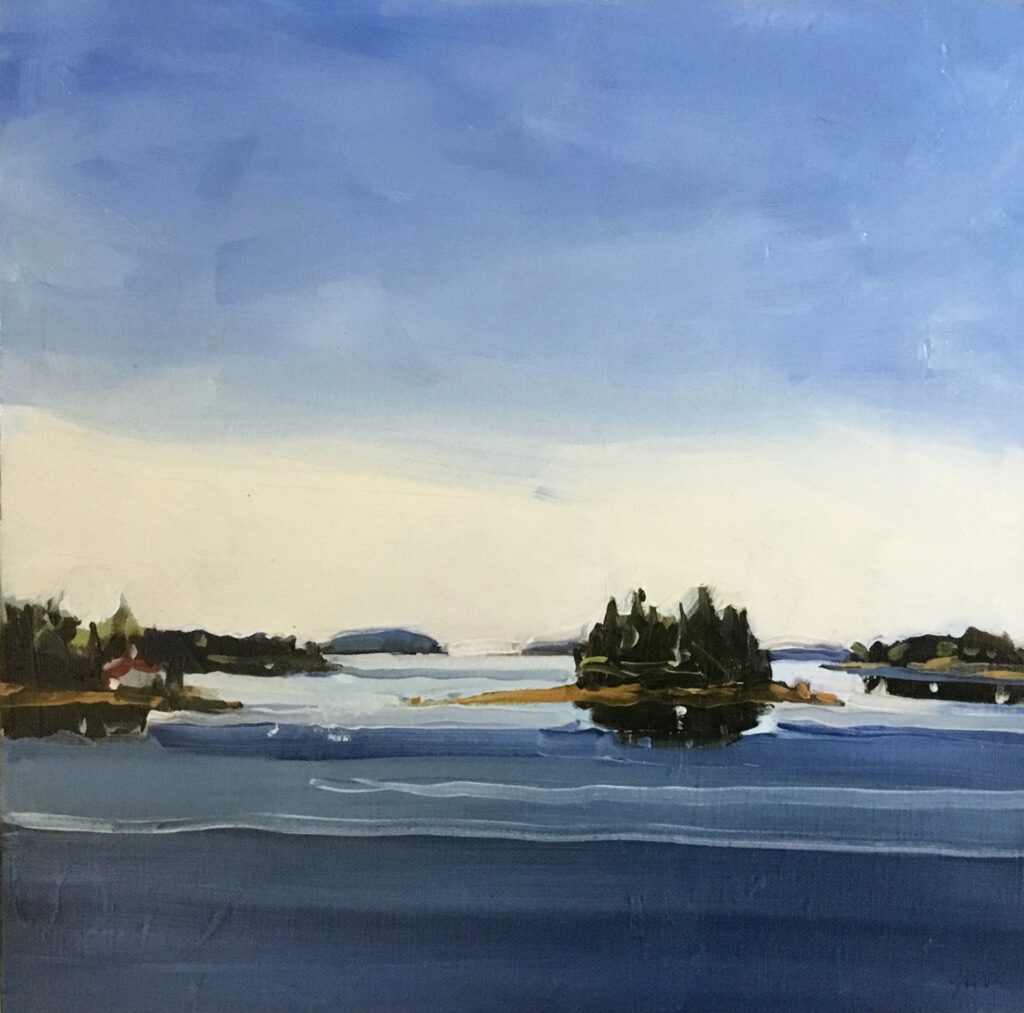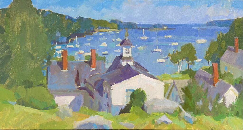 Jill Hoy has had a presence in Maine for several decades. She has summered on Deer Isle since the age of nine, and has run the Hoy Gallery in Stonington since 1986. She also exhibits her work (including short videos and taped interviews) at the Portland Art Gallery. All this time in Maine has given her a keen appreciation of the state’s natural beauty, which is reflected in her plein-air compositions. Her works have been exhibited in several venues, from the Harvard Business School to the Portland Museum of Art, as well as in US embassies around the world. Her paintings capture the energy, rhythm, and power of place in each location.