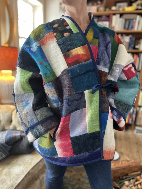 I use merino wool roving and other fibers, silk and other natural fabrics to create OOAK wet and nuno felted wearables and home decor.