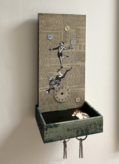 I use salvaged materials and vintage to create my pieces. I use mostly cold connections (nails, screws, wire) to combine the materials and a decoupage like process to protect the images.