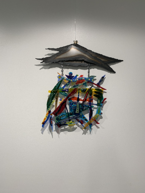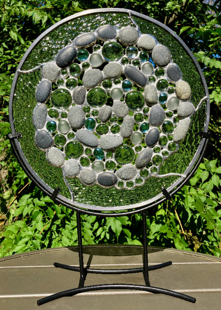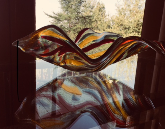 I create works with fused glass. My work consists of pieces that can be hung in a windows or on a wall, pieces that can be placed on a table or window sill, and jewelry