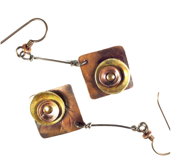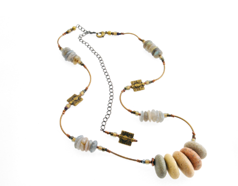 My pieces are hand crafted from mixed metals as well as other unique components like beach stones, glass beads, ceramics or found objects. Each piece is crafted with cold connections like rivets.