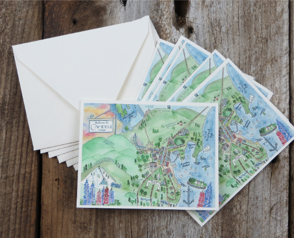 Watercolor designs with calligraphy style writing. Designs used to create greeting cards, note cards, calendars, note pads, gift tags, gift wrap, sticker sheets, whimsical maps and tea towels.