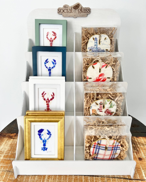 Framed Mosaic Sea Glass portraits of local landmarks & nautical themed objects. Accompanied by mini framed sea glass lobsters, decoupage sand dollars, sea glass bracelets & note cards w original art