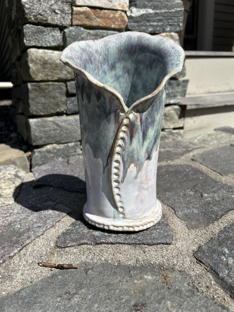 My pieces are hand made using an earthenware clay, fired to 1900 degrees Fahrenheit and each is individually glazed from a variety of 70 glazes so that all are one of a kind.