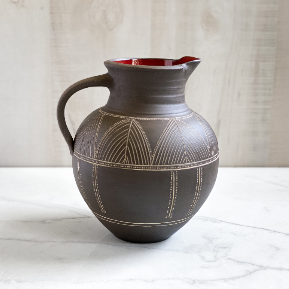 I make functional wheel thrown pottery, fired to midrange, (cone 6) in an electric kiln. I carve and stamp patterns on the surfaces of my pieces, and then inlay a white slip to bring out the patterns.