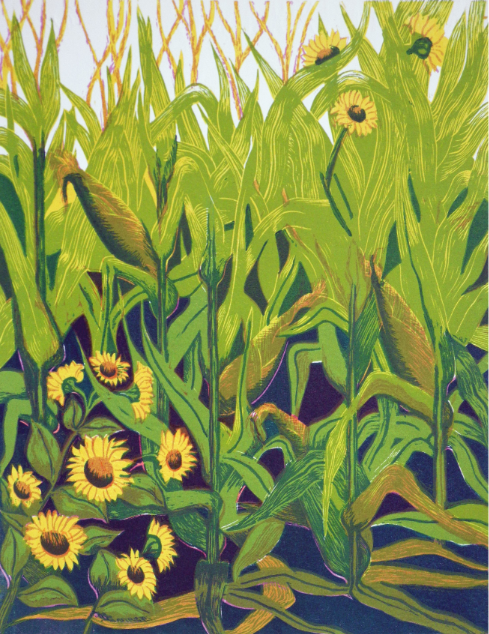 I’m a woodcut printmaker. In addition to single-block prints, I make color and b/w prints using multiple blocks as well as reduction prints where the block(s) are carved away as layers are printed.