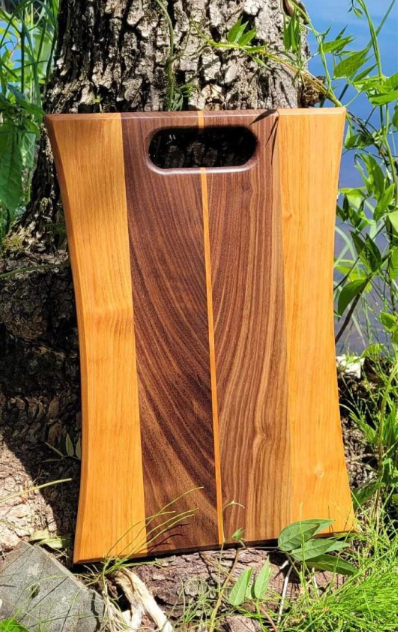 I create charcutier cutting boards from hardwoods. The shape and size of each piece is based on the grain of the wood, sanded to a silky-smooth touch, and finished with mineral oil and beeswax.