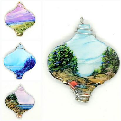I paint landscapes w/ink&resin on3x3 tiles, wirewrapped to allow art to be used as ornaments, pendants, etc
