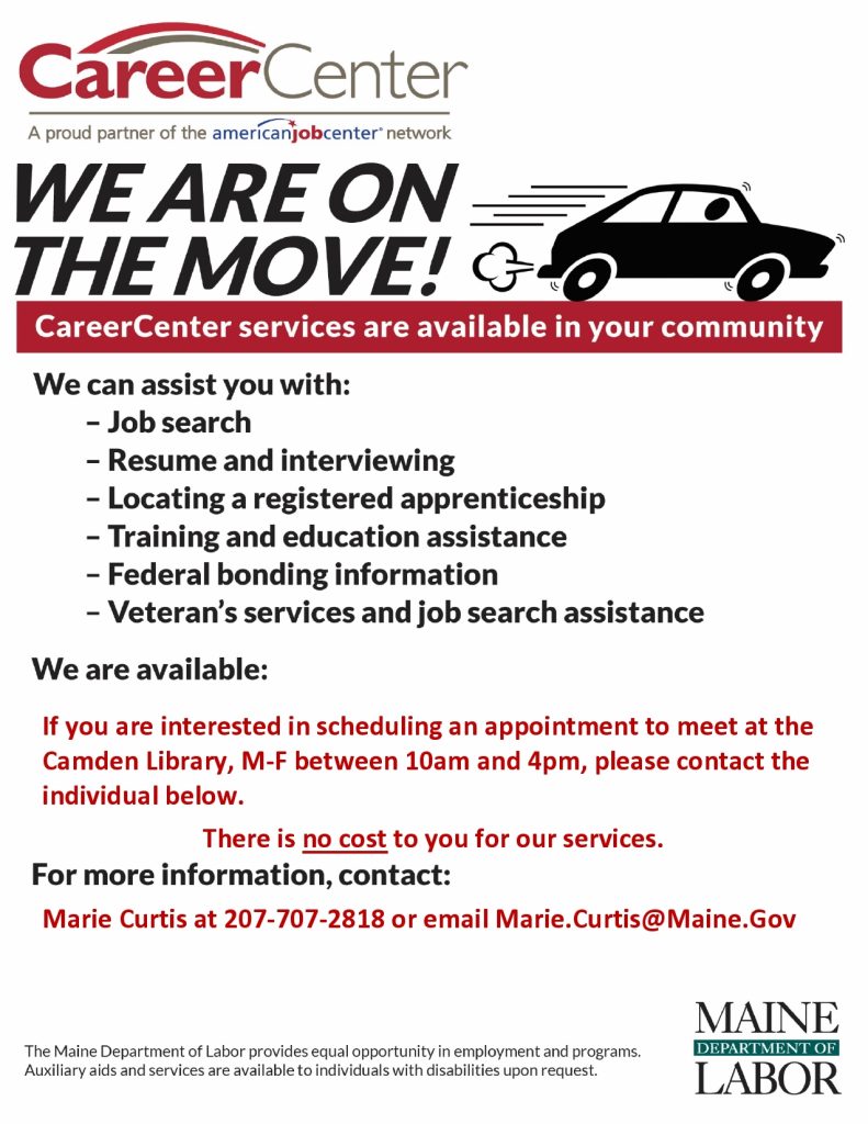 The library offers an opportunity for the public to have one-on-one career help. A representative from the Maine Department of Labor’s Career Center will have open “office hours” every 1st and 3rd Wednesday of the month, 10:00 a.m. – 12:00 p.m. on the ground floor of the library.