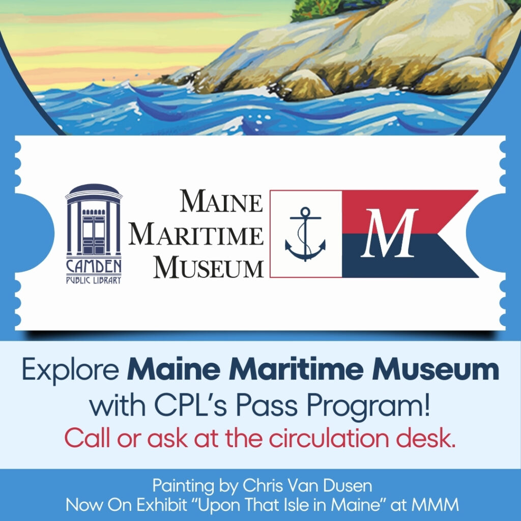 You can check out a pass at the circulation desk. For more pass information, contact the Camden Public Library at 207-236-3440. For information about MMM, visit their website at www.mainemaritimemuseum.org