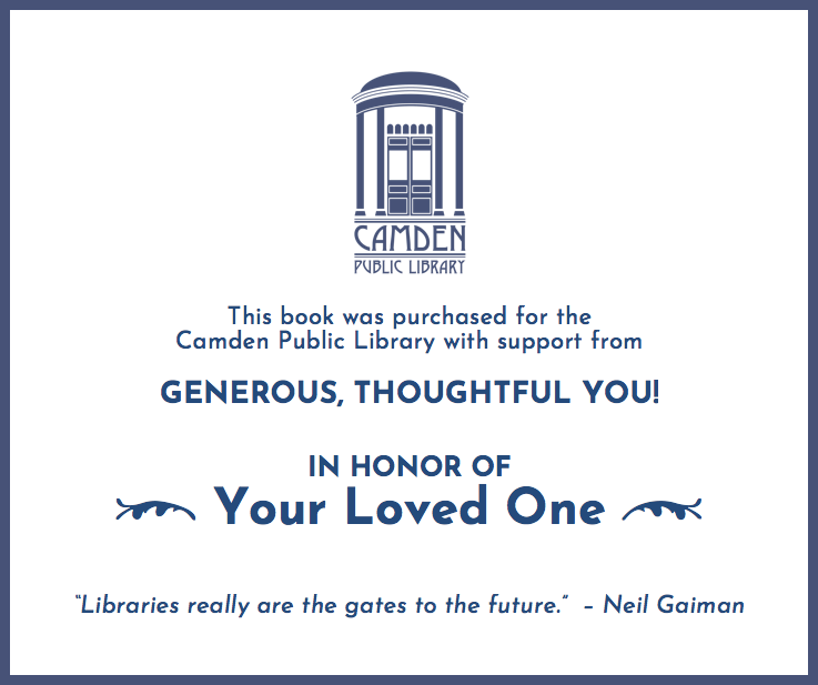 We have the perfect gift for booklovers! When you make a Stock the Stacks donation of $25 or more, we’ll create a bookplate featuring your loved one’s name. Your special bookplate dedication will then be placed in a new book circulating in the Camden Public Library.